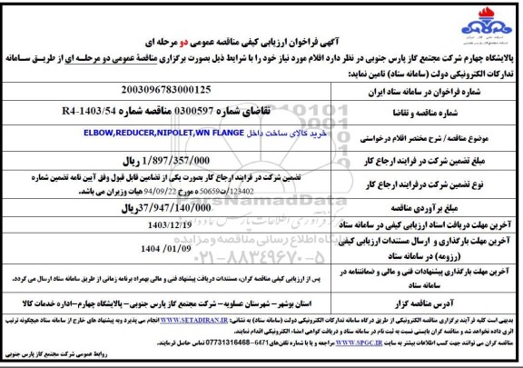 فراخوان ارزیابی کیفی خرید کالای ELBOW, REDUCER, NIPOLET, WN FLANGE از کلیه افراد متخصص و شرکتها واجد شرایط دعوت به عمل میآید در مناقصه با کد خبرگزاری پارس نماد: 8748667 شرکت نمایند.