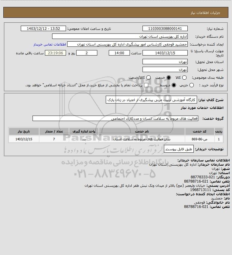 شرح کلی نیاز: کارگاه آموزشی تربیت مربی پیشگیری ار اعتیاد در زنان پازک
