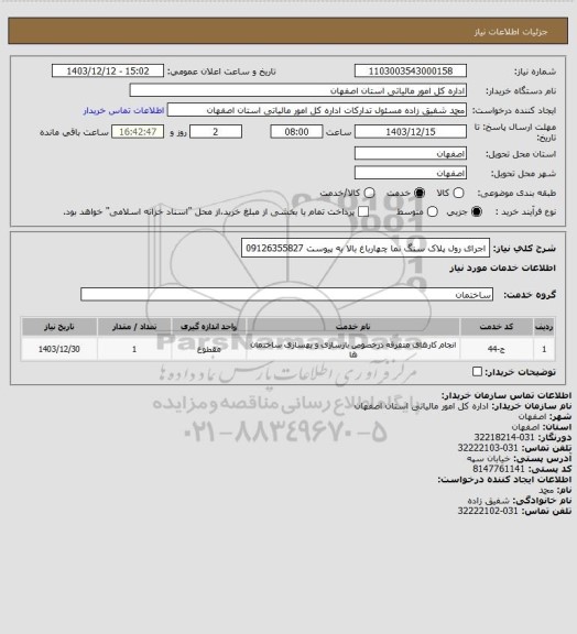شرح کلی نیاز: اجرای رول پلاک سنگ نما چهارباغ بالا به پیوست
