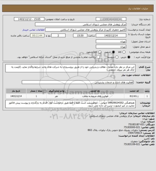 شرح کلی نیاز: این مرکز در نظر دارد خدمات نظافت و پذیرایی خود را از طریق برونسپاری به شرکت های واجد شرایط