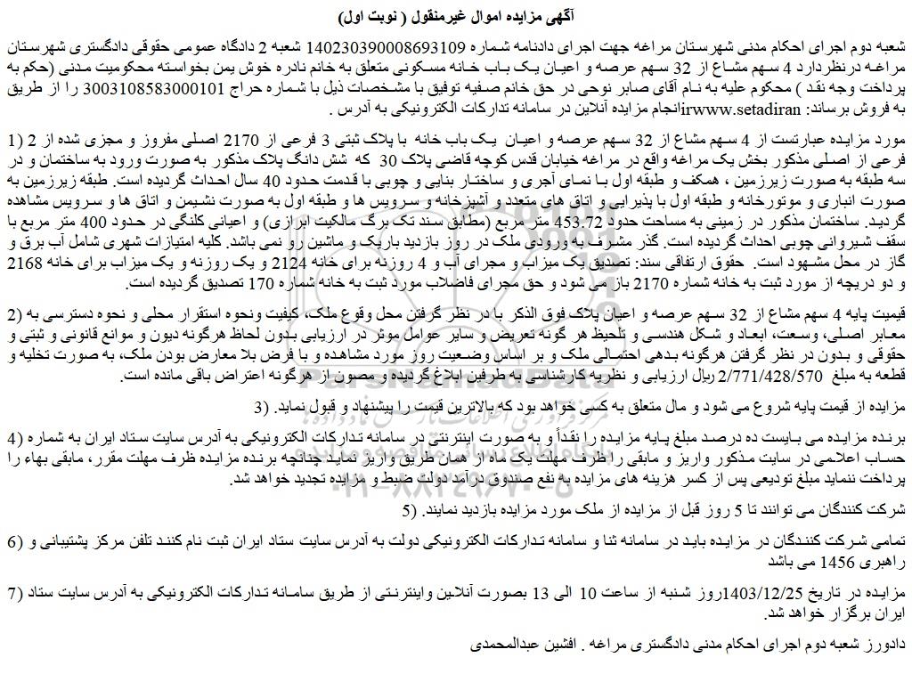 شعبه دوم اجرای احکام مدنی شهرستان مراغه جهت اجرای دادنامه شماره 140230390008693109 شعبه 2 دادگاه عمومی حقوقی دادگستری شهرستان مراغه درنظردارد 4 سهم مشاع از 32 سهم عرصه و اعیان یک باب خانه مسکونی متعلق به خانم نادره خوش یمن بخواسته محکومیت مدنی (حکم به پرداخت وجه نقد ) محکوم علیه به نام آقای صابر نوحی در حق خانم صفیه توفیق با مشخصات ذیل با شماره حراج 3003108583000101 را از طریق انجام مزایده آنلاین در سامانه تدارکات الکترونیکی به آدرس به فروش برساند: