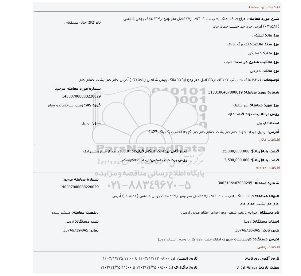 قیمت پایه(ریال): 3,500,000,000 | روش پرداخت تضمین: پرداخت الکترونیکی |