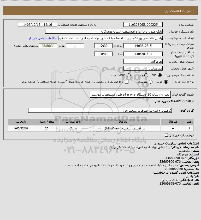 شرح کلی نیاز: تهیه و ارسال 20 دستگاه all in one طبق مشخصات پیوست