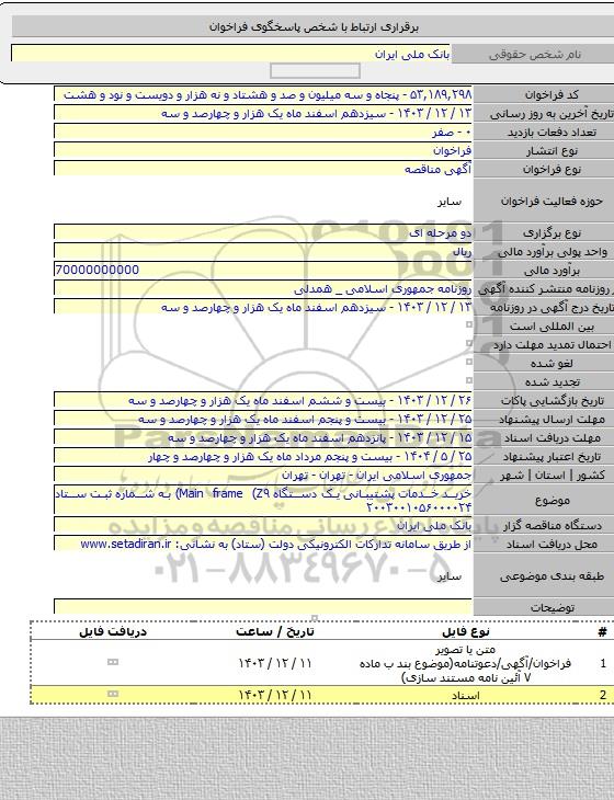 خرید خدمات پشتیبانی یک دستگاه Main frame (Z۹) به شماره ثبت ستاد ۲۰۰۳۰۰۱۰۵۶۰۰۰۰۲۴