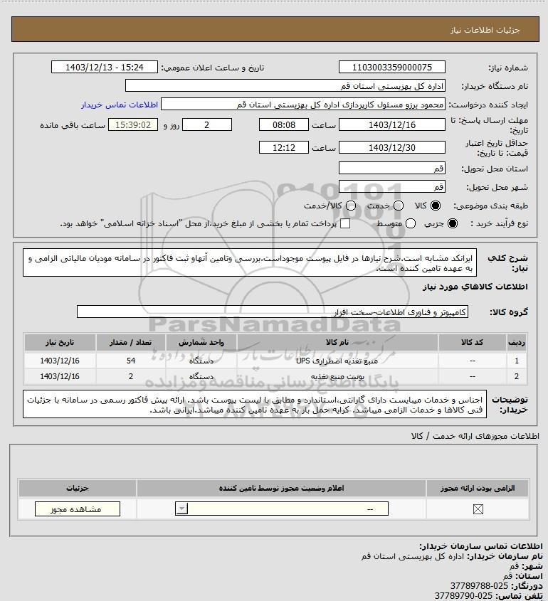 استعلام بها و موضوع استعلام استعلام ایرانکد مشابه است.شرح نیازها در فایل پیوست موجوداست،بررسی وتامین آنهاو ثبت فاکتور در سامانه مودیان مالیاتی الزامی و به عهده تامین کننده است. به اطلاع کلیه شرکت‌ها و افراد متخصص واجد شرایط می‌رساند، آگهی گذار در نظر دارد از طریق استعلام بها، نسبت به انتخاب و دریافت پیشنهادات اقدام نماید. این استعلام با کد آگهی ثبت شده در سامانه خبرگزاری پارس نماد : 8757062 منتشر شده است. مشخصات استعلام : تاریخ شروع استعلام: 1403/12/13 آخرین مهلت ارسال پیشنهاد قیمت : 1403/12/16 و محل اجرای پروژه : استان مناقصات استان قم میباشد. استعلام قیمت مورد درخواست : استعلام ایرانکد مشابه است.شرح نیازها در فایل پیوست موجوداست،بررسی وتامین آنهاو ثبت فاکتور در سامانه مودیان مالیاتی الزامی و به عهده تامین کننده است. با دسته‌بندی‌های تخصصی و گروه های مرتبط : کامپیوتر, منابع تغذیه, تجهیزات برق و الکترونیک, استعلام اطلاع رسانی میگردد.