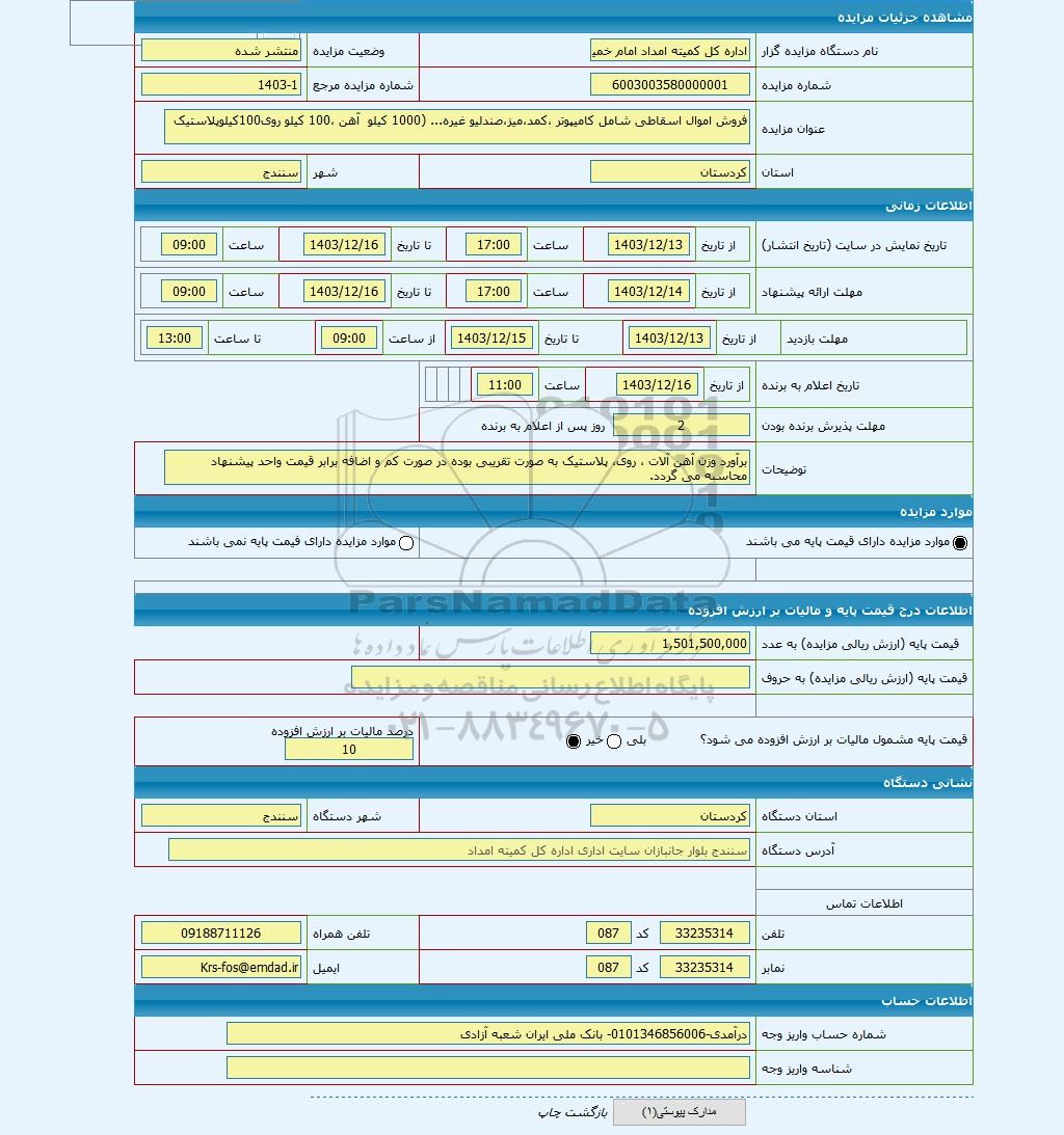 | عنوان مزایده | فروش اموال اسقاطی شامل کامیپوتر ،کمد،میز،صندلیو غیره... (1000 کیلو آهن ،100 کیلو روی100کیلوپلاستیک | |||