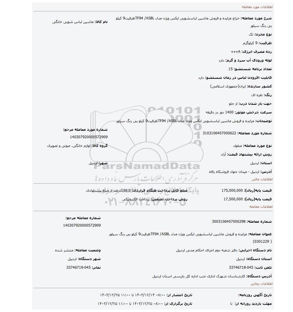 شرح مورد معامله: حراج مزایده و فروش ماشین لباسشویی ایکس ویژن مدل TF94 /ASBLظرفیت9 کیلو یی رنگ سیلور | نام کالا: ماشین لباس شویی خانگی | |