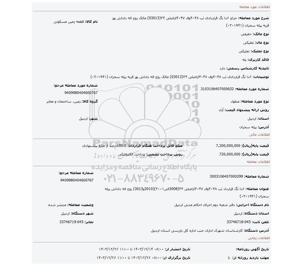 شرح مورد معامله: حراج ۶دا نگ قراردادی ثب ۴۰۴۸وف ۴۰۴۷ازاصلی ۳۴(03013) مالک روح اله داداش پور قریه پیله سحران (۰۳۰۱۹۴۱) | نام کالا: قطعه زمین مسکونی | |