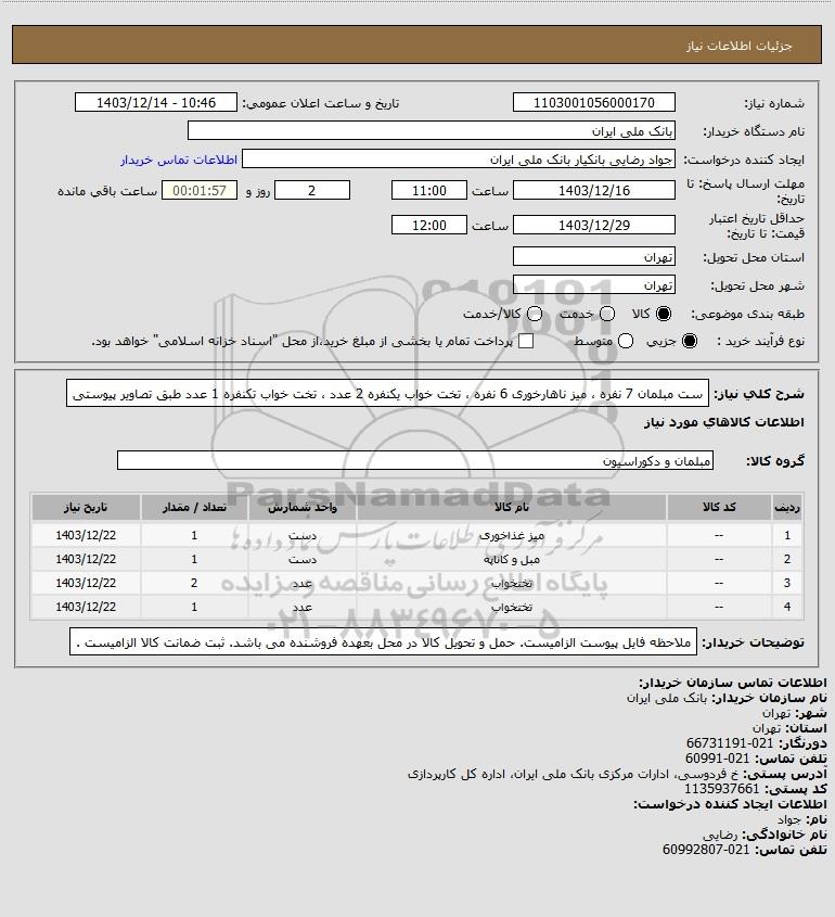 شرح کلی نیاز: ست مبلمان 7 نفره ، میز ناهارخوری 6 نفره ، تخت خواب یکنفره 2 عدد ، تخت خواب تکنفره 1 عدد طبق تصاویر پیوستی