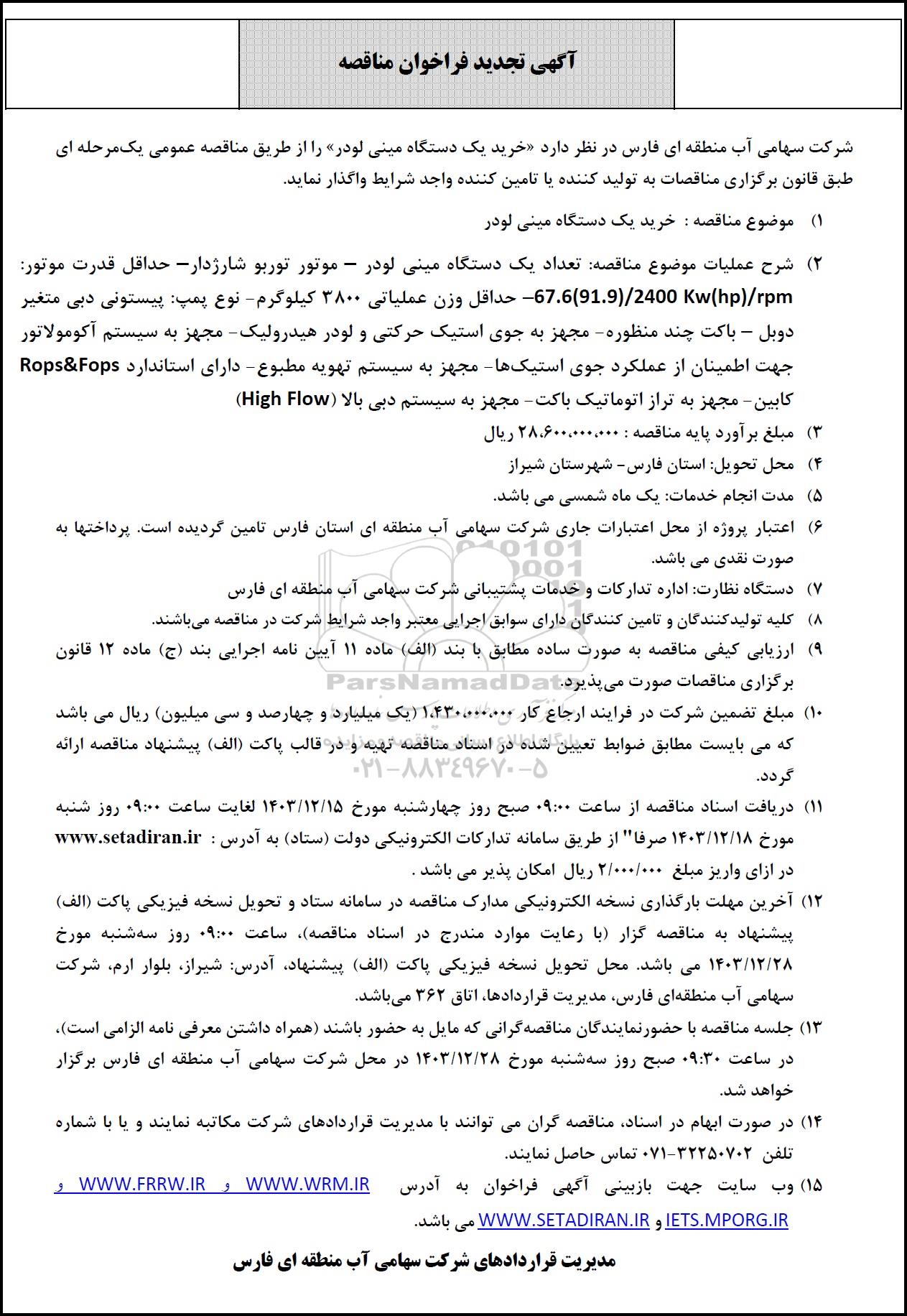 شرکت سهامی آب منطقه ای فارس در نظر دارد خرید یک دستگاه مینی لودر را از طریق مناقصه عمومی یک مرحله ای طبق قانون برگزاری مناقصات به تولید کننده یا تامین کننده واجد شرایط واگذار نماید.