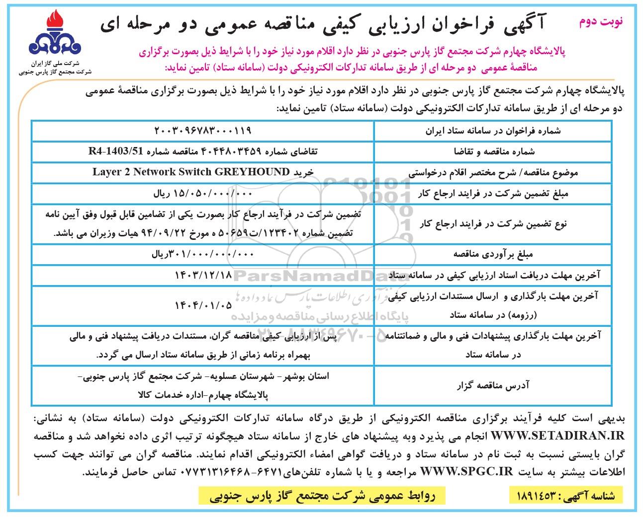 پالایشگاه چهارم شرکت مجتمع گاز پارس جنوبی در نظر دارد اقلام مورد نیاز خود را با شرایط ذیل بصورت برگزاری مناقصه عمومی یک مرحله ای از طریق سامانه تدارکات الکترونیکی دولت سامانه ستاد تامین نماید