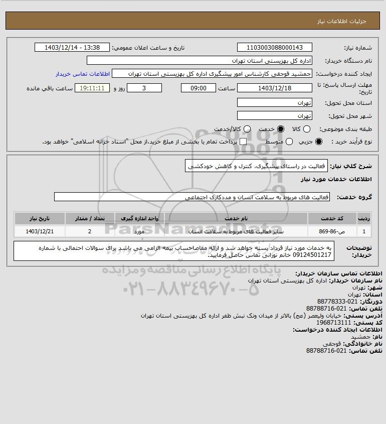 شرح کلی نیاز: فعالیت در راستای پیشگیری، کنترل و کاهش خودکشی