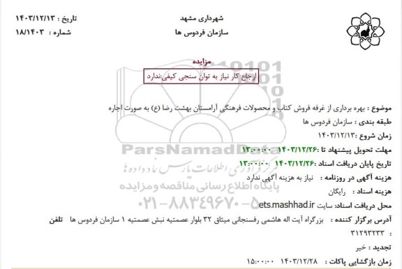 موضوع : بهره برداری از غرفه فروش کتاب و محصولات فرهنگی آرامستان بهشت رضا (ع) به صورت اجاره