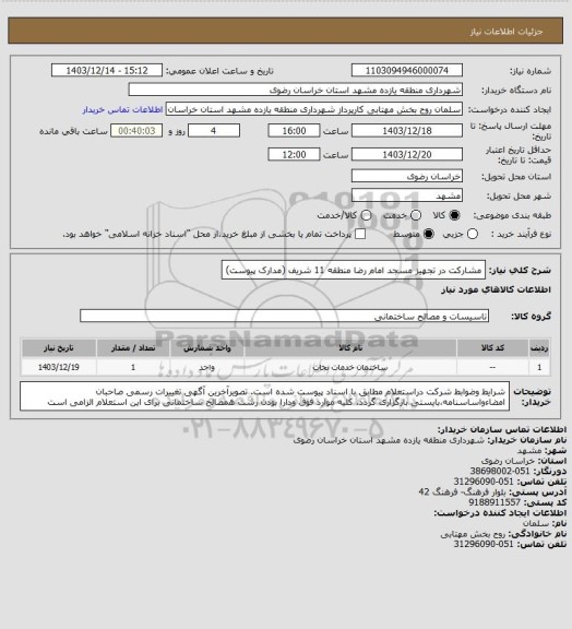 شرح کلی نیاز: مشارکت در تجهیز مسجد امام رضا منطقه 11 شریف (مدارک پیوست)