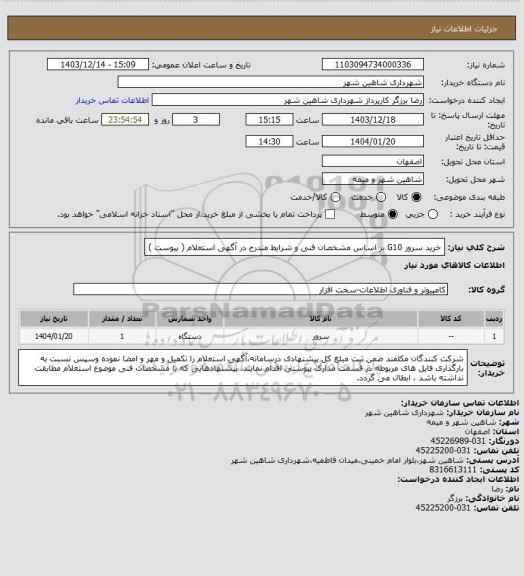شرح کلی نیاز: خرید سرور G10 بر اساس مشخصان فنی و شرایط مندرح در آگهی استعلام ( پیوست )
