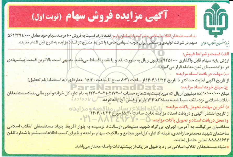 بنیاد مستضعفان انقلاب اسلامی و شرکت پایا سامان پارس قصد دارند نسبت به فروش 100 درصد سهام خود معادل 561.391.000 سهم در شرکت تولیدی و صنعتی ایران چوب (سهامی خاص) با شرایط مندرج در اسناد مزایده به شرح ذیل اقدام نمایند.