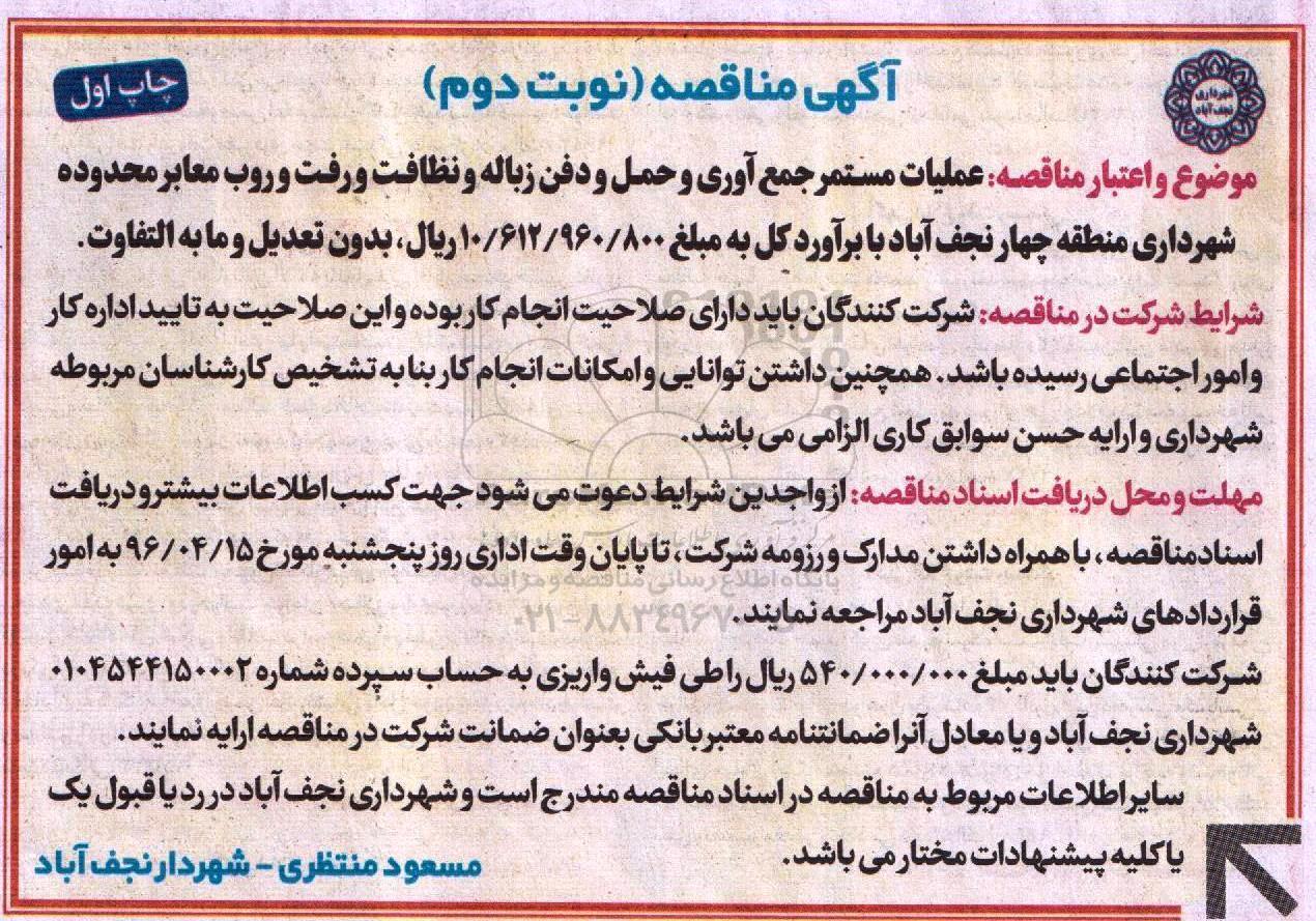 مناقصه عملیات مستمر جمع آوری و حمل و دفن زباله و ... نوبت دوم - چاپ اول , آگهی مناقصه ,مناقصه عملیات مستمر جمع آوری و حمل و دفن زباله و ... نوبت دوم - چاپ اول