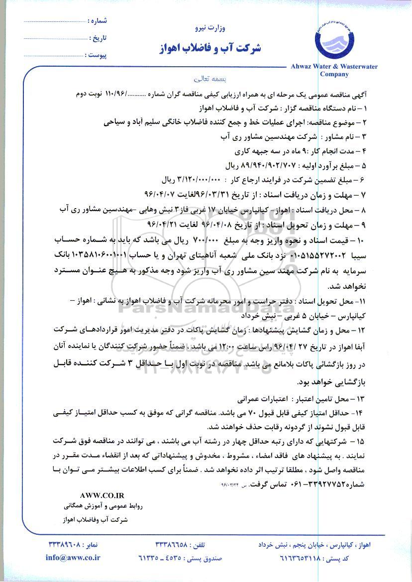 2- موضوع مناقصه: اجرای عملیات خط و جمع کننده فاضلاب خانگی سلیم آباد و سیاحی