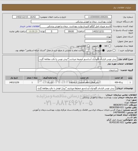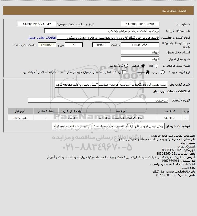 شرح کلی نیاز: پیش نویس قرارداد نگهداری آسانسور ضمیمه میباشد *پیش نویس با دقت مطالعه گردد