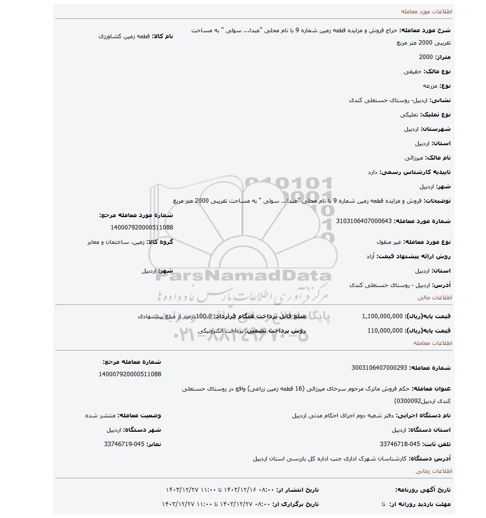 شرح مورد معامله: حراج فروش و مزایده قطعه زمین شماره 9 با نام محلی "عبدا... سولی " به مساحت تقریبی 2000 متر مربعنام کالا: قطعه زمین کشاورزی