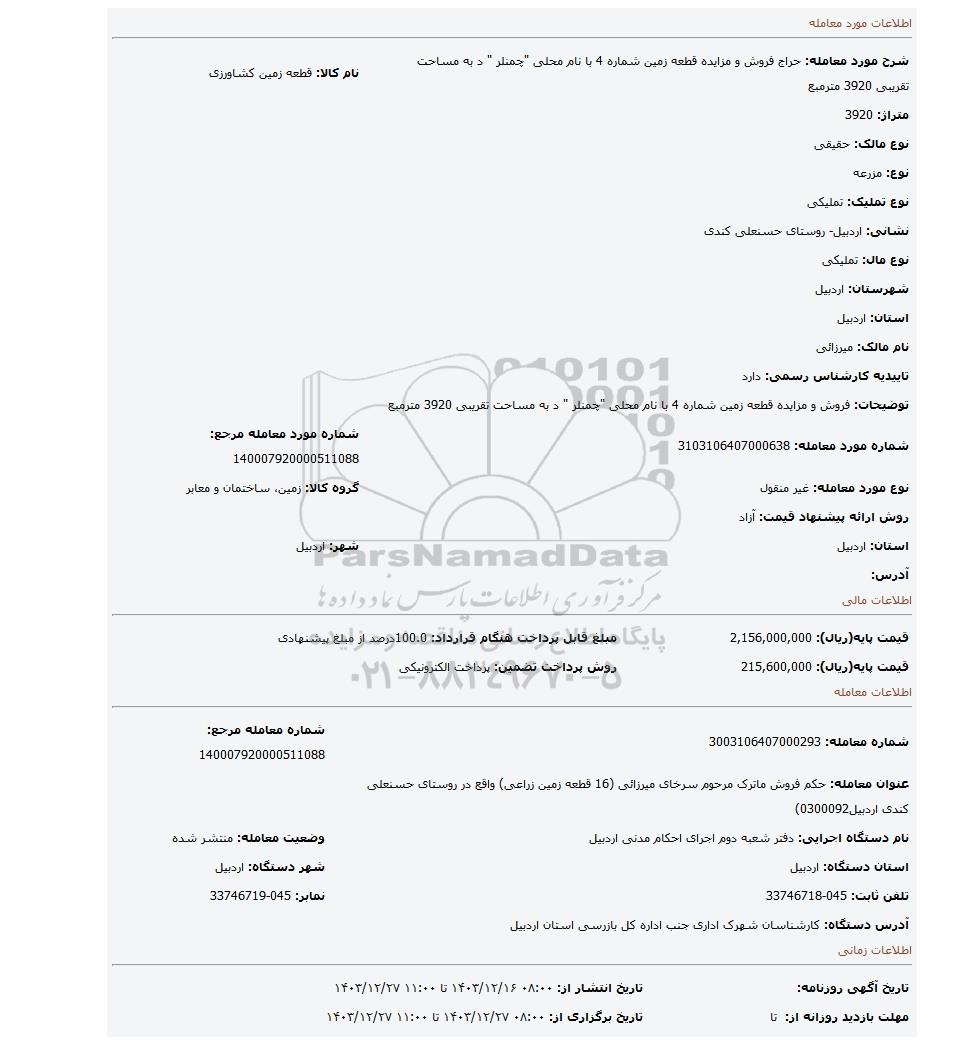 شرح مورد معامله: حراج فروش و مزایده قطعه زمین شماره 4 با نام محلی "چمنلر " د به مساحت تقریبی 3920 مترمبع | نام کالا: قطعه زمین کشاورزی | |