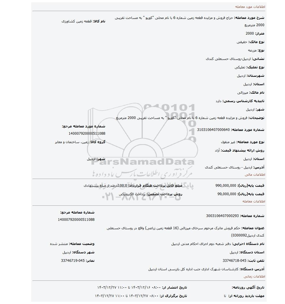 شرح مورد معامله: حراج فروش و مزایده قطعه زمین شماره 6 با نام محلی "کورپو " به مساحت تقریبی 2000 مترمربع | نام کالا: قطعه زمین کشاورزی | |