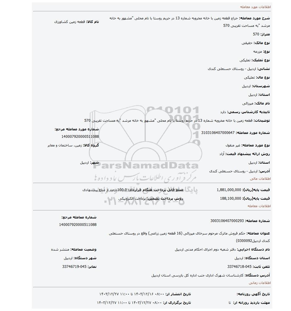 14 مزایده فروش یک قطعه زمین موسوم به کهنه باغ کند قراغی به شماره پلاک 122فرعی از421اصلی بخش03 9634710 1404/07/10 new not special not payed اردبیل
