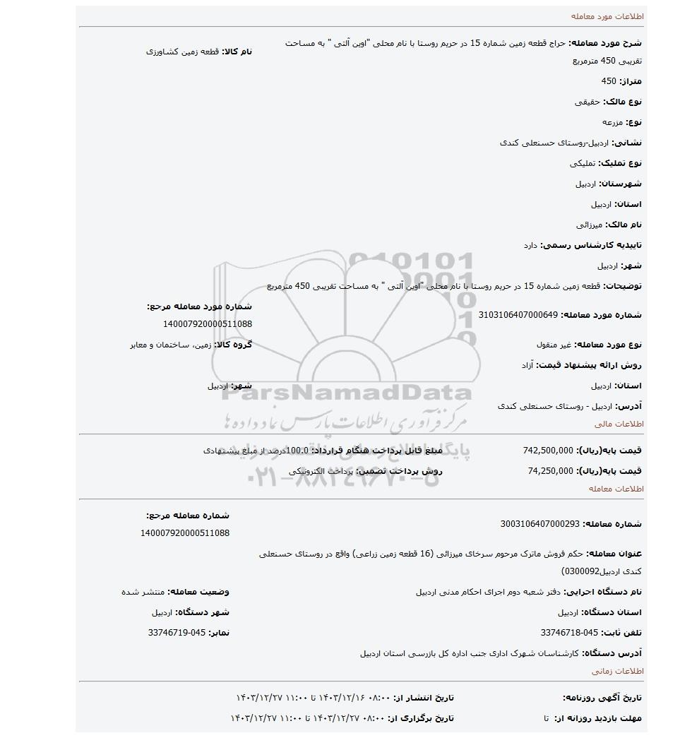 شرح مورد معامله: حراج قطعه زمین شماره 15 در حریم روستا با نام محلی "اوین آلتی " به مساحت تقریبی 450 مترمربعنام کالا: قطعه زمین کشاورزی