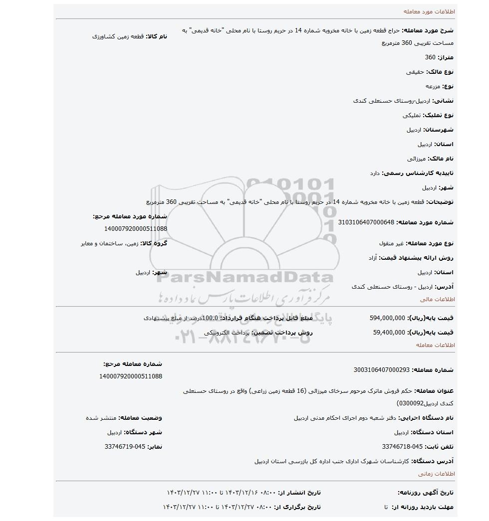 عنوان معامله: حکم فروش ماترک مرحوم سرخای میرزائی (16 قطعه زمین زراعی) واقع در روستای حسنعلی کندی اردبیل0300092) | ||