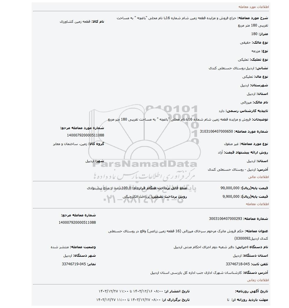 شرح مورد معامله: حراج فروش و مزایده قطعه زمین شام شماره 16با نام محلی "باغچه " به مساحت تقریبی 180 متر مربعنام کالا: قطعه زمین کشاورزی