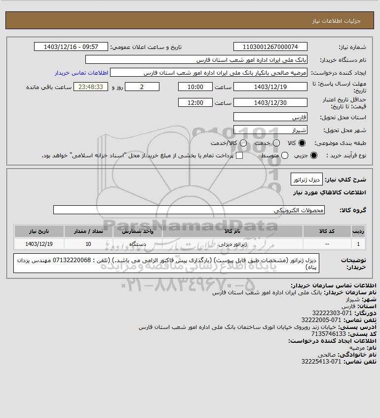 | 1 | -- | ژنراتور دیزلی | دستگاه | 10 | 1403/12/19 |