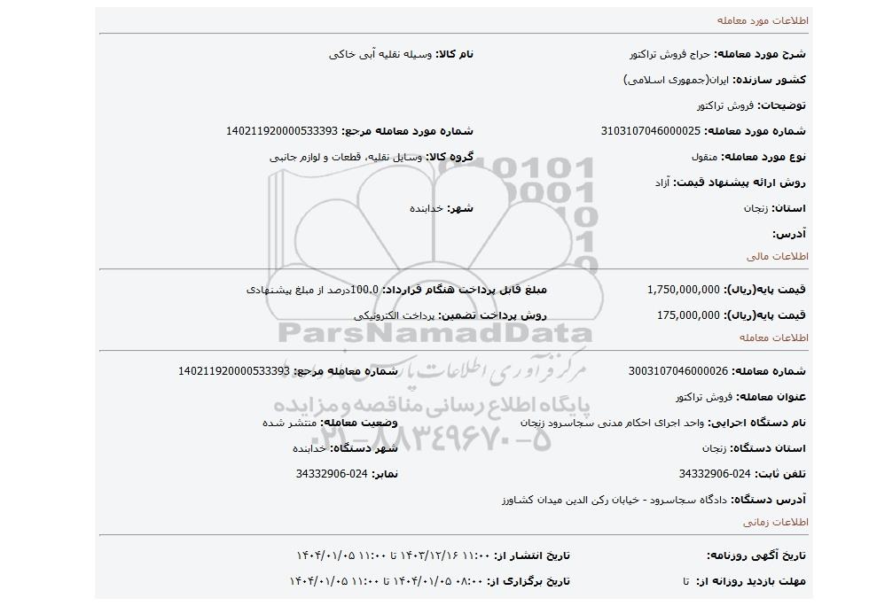 | شماره مورد معامله: 3103107046000025 | شماره مورد معامله مرجع: 140211920000533393 | |