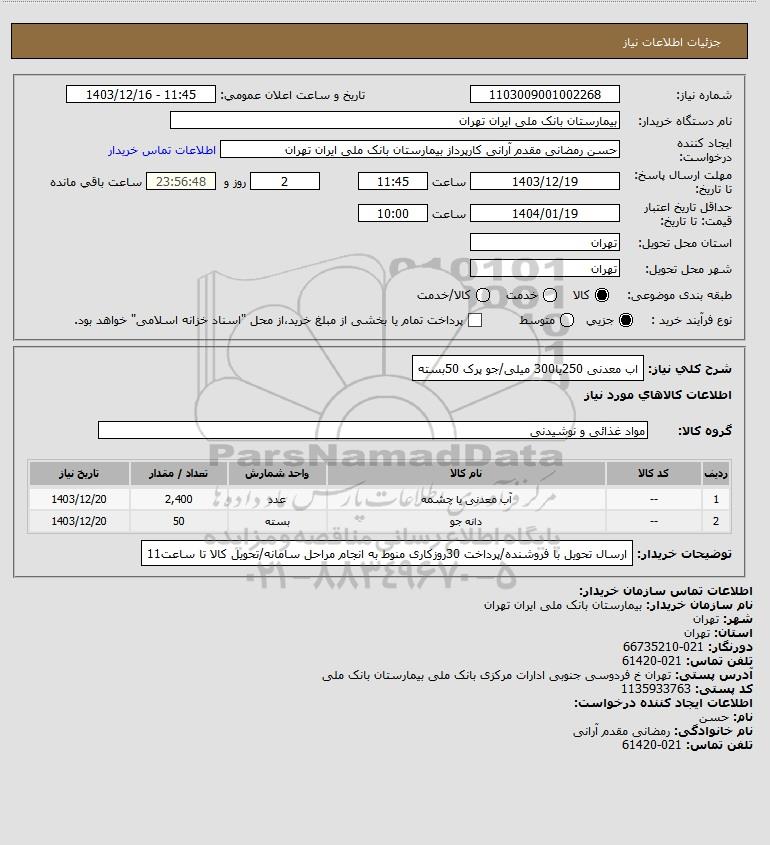 شرح کلی نیاز: اب معدنی 250یا300 میلی/جو پرک 50بسته