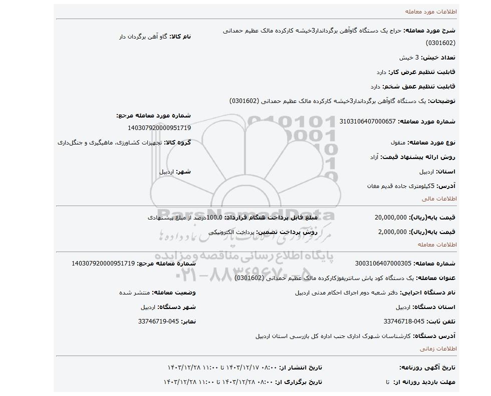 مزایده عمومی مزایده یک دستگاه گاوآهن برگرداندار3خیشه کارکرده مالک عظیم حمدانی (0301602) برگزار میگردد. از کلیه افراد متخصص و شرکت‌های واجد شرایط دعوت به عمل می‌آید تا در این مزایده با کد خبرگزاری پارس نماد : 8772274 شرکت نمایند تاریخ شروع مزایده : 1403/12/17 مهلت شرکت در مزایده: تا پایان روز 1403/12/28 مکان برگزاری اموال واگذاری استان‌های اردبیل و دسته‌بندی‌های مربوط به این حراجی ماشین آلات و تجهیزات کشاورزی و دام پروری میباشد. اطلاعات دقیق‌تر درباره شرایط شرکت در مزایده آنلاین و نحوه ارسال مدارک، الزامات پروژه و دریافت اسناد مزایده و تاریخ بازگشایی پاکت‌ها، در بخش اطلاعات تکمیلی این آگهی درج شده است.