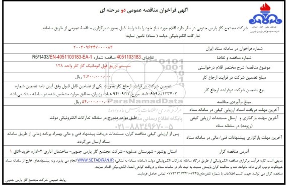 شرکت مجتمع گاز پارس جنوبی در نظر دارد اقلام مورد نیاز خود را با شرایط ذیل بصورت برگزاری مناقصه عمومی از طریق سامانه تدارکات الکترونیکی دولت ( ستاد) تامین نماید: