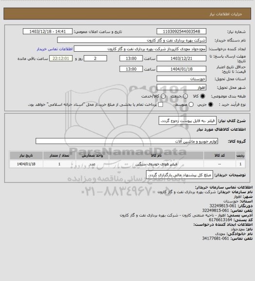 شرح کلی نیاز: فیلتر ،به فایل پیوست رجوع گردد.