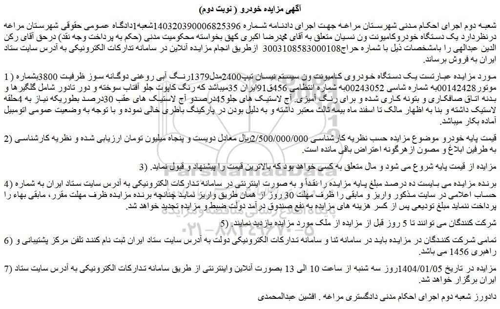 شعبه دوم اجرای احکام مدنی شهرستان مراغه جهت اجرای دادنامه شماره 140320390006825396شعبه1دادگاه عمومی حقوقی شهرستان مراغه درنظردارد یک دستگاه خودروکامیونت ون نسیان متعلق به آقای محمدرضا اکبری کهق بخواسته محکومیت مدنی (حکم به پرداخت وجه نقد) درحق آقای رکن الدین عبدالهی را بامشخصات ذیل با شماره حراج3003108583000108 ازطریق انجام مزایده آنلاین در سامانه تدارکات الکترونیکی به آدرس سایت ستاد ایران به فروش برساند.