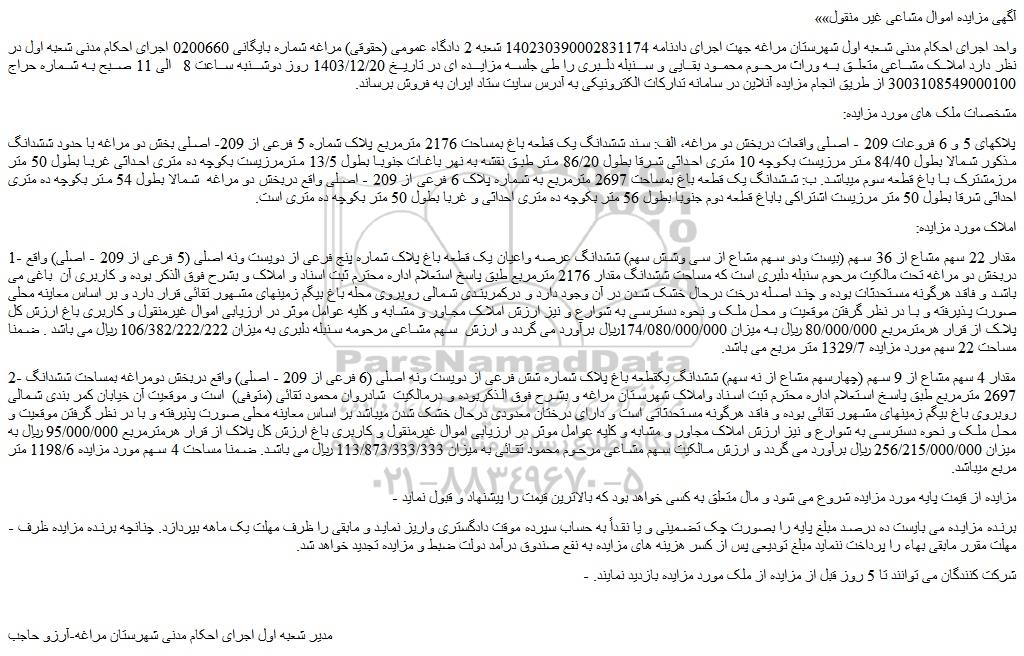 1- مقدار 22 سهم مشاع از 36 سهم (بیست ودو سهم مشاع از سی وشش سهم) ششدانگ عرصه واعیان یک قطعه باغ پلاک شماره پنج فرعی از دویست ونه اصلی (5 فرعی از 209 - اصلی) واقع دربخش دو مراغه تحت مالکیت مرحوم سنبله دلبری است که مساحت ششدانگ مقدار 2176 مترمربع طبق پاسخ استعلام اداره محترم ثبت اسناد و املاک و بشرح فوق الذکر بوده و کاربری آن باغی می باشد و فاقد هرگونه مستحدثات بوده و چند اصله درخت درحال خشک شدن در آن وجود دارد و درکمربندی شمالی روبروی محله باغ بیگم زمینهای مشهور تقائی قرار دارد و بر اساس معاینه محلی صورت پذیرفته و با در نظر گرفتن موقعیت و محل ملک و نحوه دسترسی به شوارع و نیز ارزش املاک مجاور و مشابه و کلیه عوامل موثر در ارزیابی اموال غیرمنقول و کاربری باغ ارزش کل پلاک از قرار هرمترمربع 80/000/000 ریال به میزان 174/080/000/000ریال برآورد می گردد و ارزش سهم مشاعی مرحومه سنبله دلبری به میزان 106/382/222/222 ریال می باشد . ضمنا مساحت 22 سهم مورد مزایده 1329/7 متر مربع می باشد.