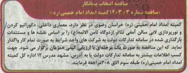 کمیته امداد امام خمینی (ره) خراسان رضوی در نظر دارد معماری داخلی دکوراتیو کردن و نورپردازی لابی سالن آمفی تئاتر اردوگاه ثامن الائمه (ع) را بر اساس نقشه ها و مستندات بارگذاری شده در سامانه تدارکات دولت به شرکتهای واجد شرایط به صورت تمام کار واگذار نماید که این مناقصه به صورت یک مرحله ای با ارزیابی کیفی همزمان برگزار می شود. جهت کسب اطلاعات بیشتر به سامانه تدارکات دولت یا به آدرس مشهد مدرس 12 اداره کل کمیته امداد امام خمینی (ره) طبقه سوم اتاق 308 مراجعه فرمایند.
