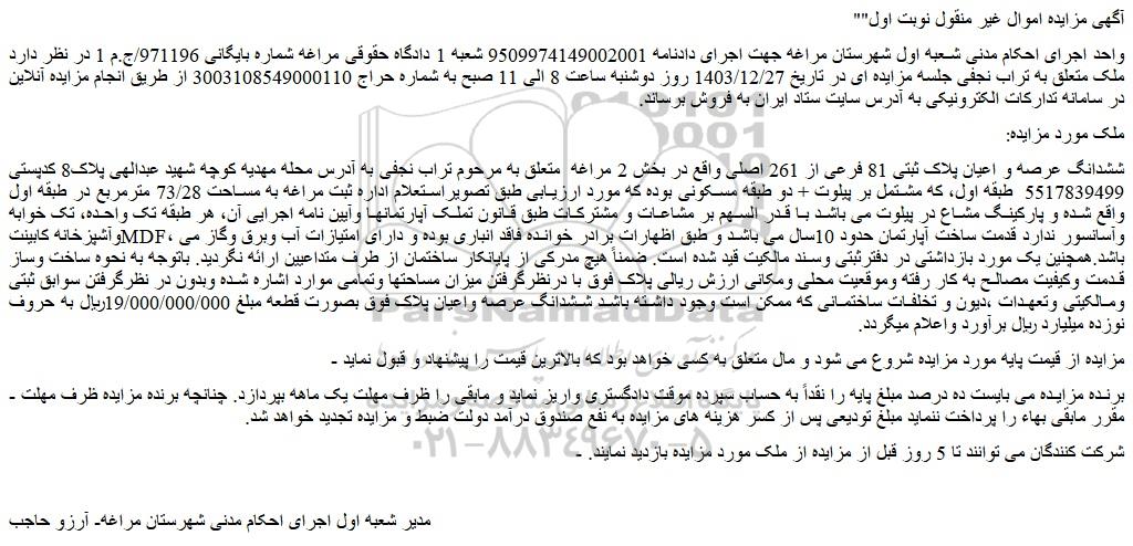 واحد اجرای احکام مدنی شعبه اول شهرستان مراغه جهت اجرای دادنامه 9509974149002001 شعبه 1 دادگاه حقوقی مراغه شماره بایگانی 971196/ج.م 1 در نظر دارد ملک متعلق به تراب نجفی جلسه مزایده ای در تاریخ 1403/12/27 روز دوشنبه ساعت 8 الی 11 صبح به شماره حراج 3003108549000110 از طریق انجام مزایده آنلاین در سامانه تدارکات الکترونیکی به آدرس سایت ستاد ایران به فروش برساند.