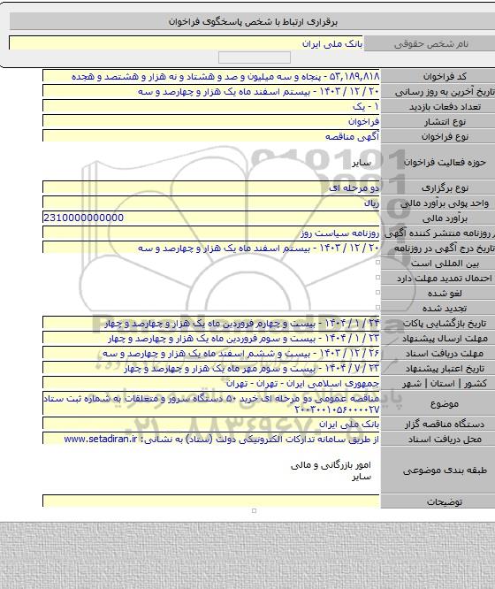 مناقصه عمومی دو مرحله ای خرید ۵۰ دستگاه سرور و متعلقات به شماره ثبت ستاد ۲۰۰۳۰۰۱۰۵۶۰۰۰۰۲۷