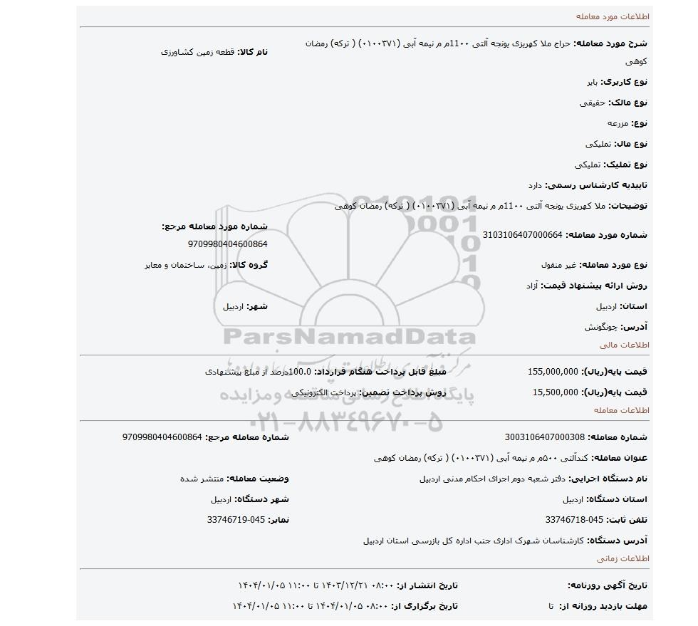 14 مزایده فروش یک قطعه زمین موسوم به کهنه باغ کند قراغی به شماره پلاک 122فرعی از421اصلی بخش03 9634710 1404/07/10 new not special not payed اردبیل