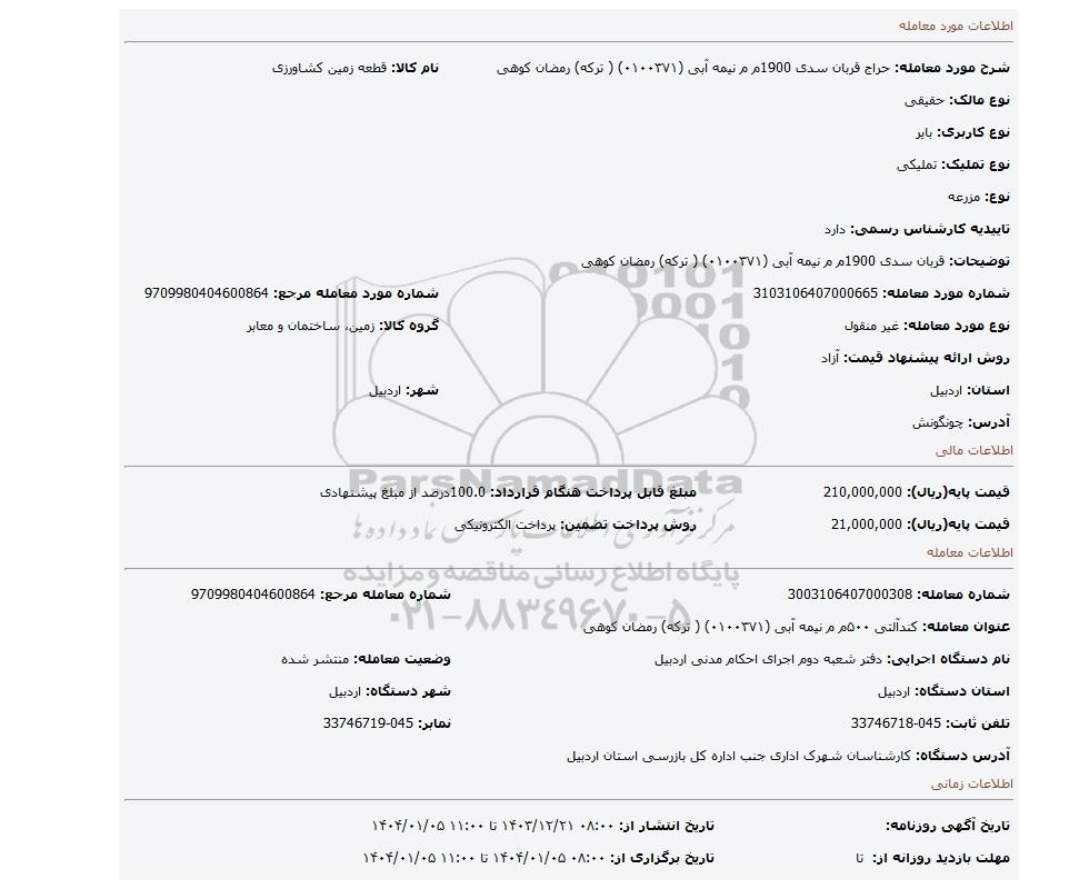 شرح مورد معامله: حراج قربان سدی 1900م م نیمه آبی (۰۱۰۰۳۷۱) ( ترکه) رمضان کوهی | نام کالا: قطعه زمین کشاورزی | |