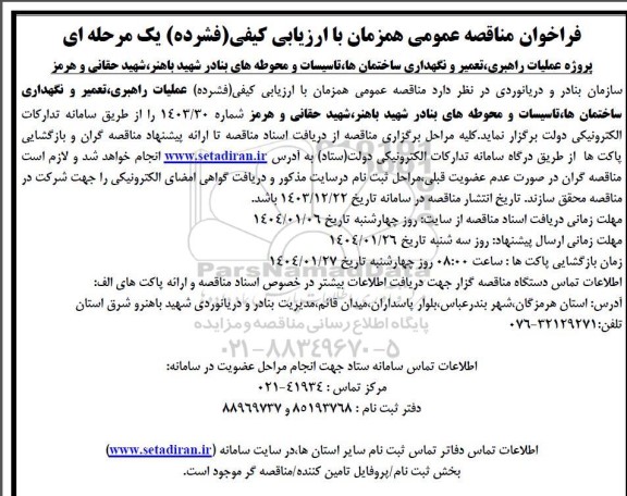 سازمان بنادر و دریانوردی در نظر دارد مناقصه عمومی همزمان با ارزیابی کیفی فشرده عملیات راهبری، تعمیر و نگهداری ساختمان ها تاسیسات و محوطه های بنادر شهید باهنر شهید حقانی و هرمز شماره 1403.30 را از طریق سامانه تدارکات الکترونیکی دولت برگزار نماید کلیه مراحل برگزاری مناقصه از دریافت اسناد مناقصه تا ارائه پیشنهاد مناقصه گران و بازگشایی پاکتها از طریق درگاه سامانه تدارکات الکترونیکی دولت (ستاد به آدرس سایت ستاد ایران انجام خواهد شد و لازم است مناقصه گران در صورت عدم عضویت قبلی مراحل ثبت نام در سایت مذکور و دریافت گواهی امضای الکترونیکی را جهت شرکت در
