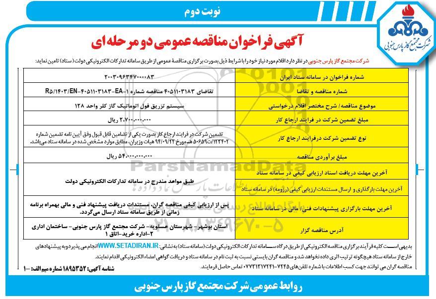 شرکت مجتمع گاز پارس جنوبی در نظر دارد اقلام مورد نیاز خود را با شرایط ذیل بصورت برگزاری مناقصه عمومی از طریق سامانه تدارکات الکترونیکی دولت ( ستاد) تامین نماید: