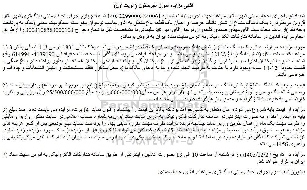 شعبه دوم اجرای احکام مدنی شهرستان مراغه جهت اجرای نیابت شماره 140322990003840061 شعبه چهارم اجرای احکام مدنی دادگستری شهرستان قزوین درنظردارد یک دانگ مشاع از شش دانگ عرصه و اعیان یک قطعه باغ متعلق به آقای جاسب نوجوان بخواسته محکومیت مدنی (حکم به پرداخت وجه نقد )از بابت محکومیت آقای مهدی صمدی کلخوران درحق آقای امیر محمد سلیمانی با مشخصات ذیل با شماره حراج 3003108583000103 را ازطریق انجام مزایده آنلاین در سامانه تدارکات الکترونیکی به آدرس سایت ستاد ایران به فروش برساند: