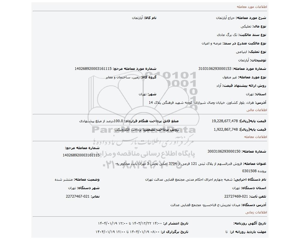 | نام دستگاه اجرایی: شعبه چهارم اجرای احکام مدنی مجتمع قضایی عدالت تهران | وضعیت معامله: منتشر شده | |
