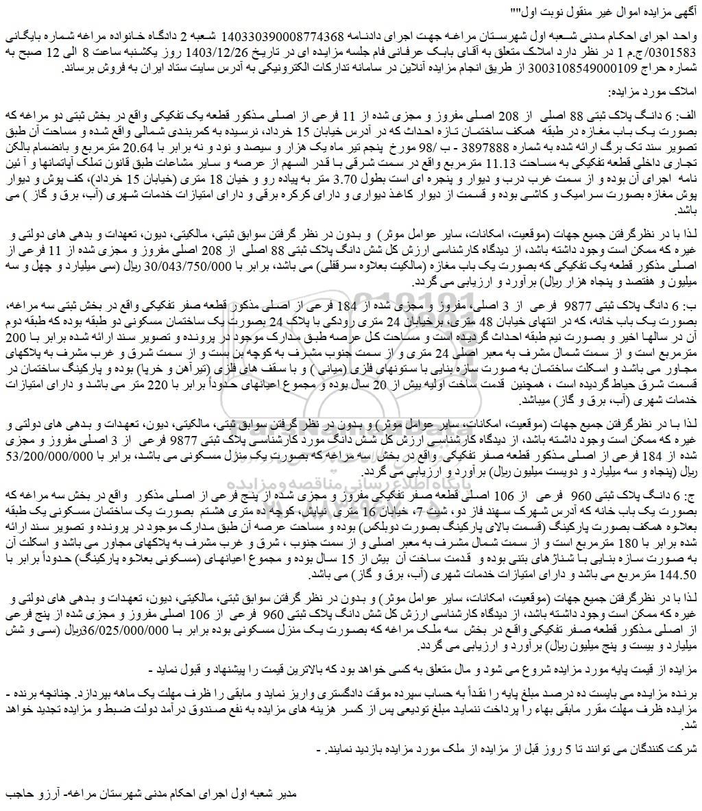 واحد اجرای احکام مدنی شعبه اول شهرستان مراغه جهت اجرای دادنامه 140330390008774368 شعبه 2 دادگاه خانواده مراغه شماره بایگانی 0301583/ج.م 1 در نظر دارد املاک متعلق به آقای بابک عرفانی فام جلسه مزایده ای در تاریخ 1403/12/26 روز یکشنبه ساعت 8 الی 12 صبح به شماره حراج 3003108549000109 از طریق انجام مزایده آنلاین در سامانه تدارکات الکترونیکی به آدرس سایت ستاد ایران به فروش برساند.