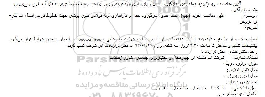 آگهی مناقصه خرید (تهیه)، بسته بندی، بارگیری، حمل و باراندازی لوله فولادی بدون پوشش جهت خطوط فرعی انتقال آب طرح بن_بروجن