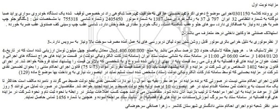 در پرونده کلاسه 0301150اجرایی موضوع دعوی اکرم محمد حسینی عارفی به طرفیت محمدرضا شکوهی راد درخصوص توقیف شده یک دستگاه خودروی سواری پراید صبا دوگانه به شماره انتظامی 32 ایران 797 ق 37 به رنگ نقره ای مدل 1387 به شماره موتور 2405450 وشماره شاسی 755318 با مشخصات ذیل : 1-گلگیرجلو چپ ضربه خورده ونیاز به صافکاری دارد، سپرهای جلو وعقب شکسته است، رنگ خودرو مقداری خط وخش دارد، شاسی عقب چپ وسینی کف صندوق عقب ضربه خورده .